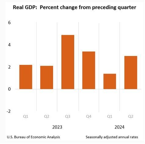 In spite of the COVID-19 pandemic’s adverse effects on productivity, supply chains, and economic output worldwide, the U.S. economy has recovered relatively well during the past couple of years. In 2023, the U.S. economy grew at an average rate of 2.5 percent, indicating modest growth. Although there were some fears of economic decline (and trepidation concerning a potential recession), the U.S. economy has rebounded and created jobs, raising overall economic output. The figure below shows the percent change in real GDP (adjusted for inflation) in the United States during the past six quarters. As we can observe, throughout this time period, the U.S. economy has had positive economic growth.