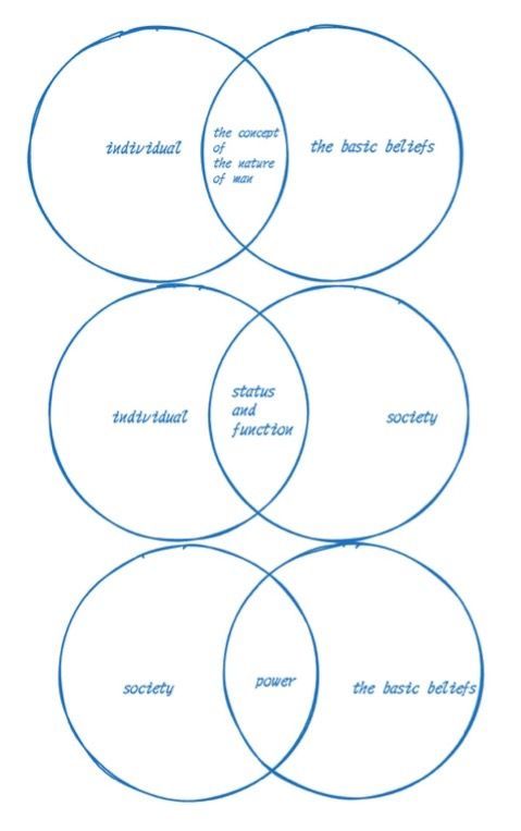 Tension between the individual and society's basic beliefs. "Society's basic beliefs" refer to two questions every society must answer: What is human? How should humans achieve fulfillment in life? Christianity provided answers to these questions, while Hinduism and Buddhism offered different answers. European society as a whole is a Christian civilization. Throughout its long history, Europeans' understanding of these two questions was shaped by Christianity. However, in different historical periods, Europeans sought their fulfillment in different social domains, leading to different "concepts of the nature of man" such as Spiritual Man, Intellectual Man, and Economic Man. Spiritual Man, Intellectual Man, and Economic Man all pursued the freedom and equality revealed by Christianity, but they sought these in entirely different domains. Thus, we have one set of tension: the tension between individuals and beliefs about human nature, with the "concept of human nature" serving as the mediator of this tension.